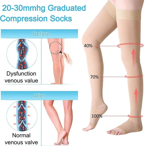 1 Pair Thigh High Compression Stockings for Women, Open Toe, 20-30 mmHg